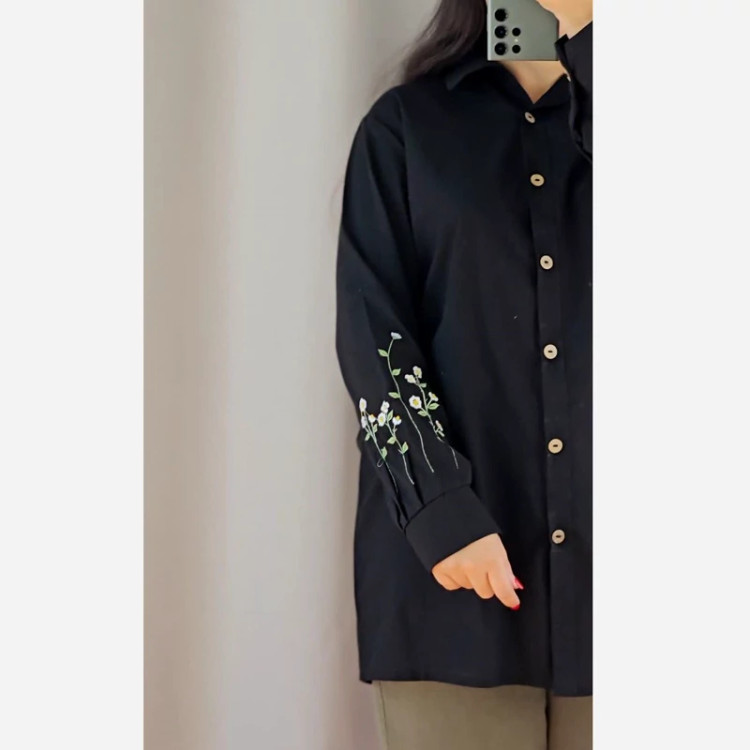 مانتو زنانه مشکی مدل اطلسی گلدوزی شده جنس پارچه لینن، تماما نخ بدون آبرفت بدون رنگرفت فری سایز از 42 تا 46 و گاها 48 دورسینه 116 سانتیمتر قد آستین 58 سانتیمتر دورباسن 122 سانتیمتر قد 83 سانتیمتر