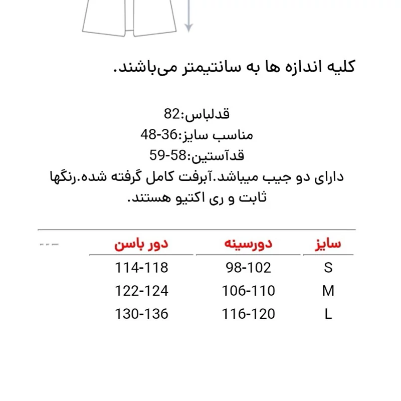 قواره کارها متفاوته. جهت اطمینان از سایز درست، حتماً عرض سینه یکی از مانتوهای خودتون رو اندازه بگیرید و ضربدر دو کنید، سپس با جدول راهنمای سایز در عکس آخر مقایسه کنید.