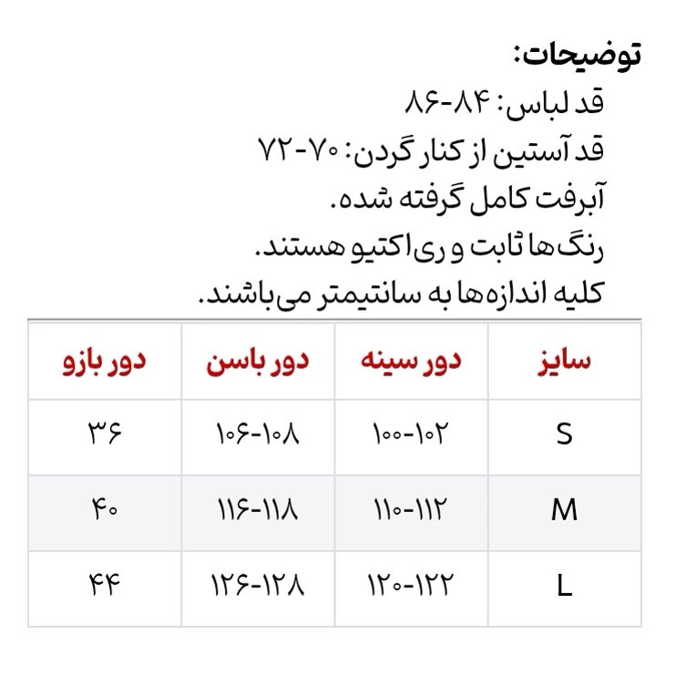 مانتو محرمی سایز بزرگ زنانه مدل چیکا الیاف طبیعی گلدوزی شده بدون آبرفت رنگ مشکی و طوسی سه سایز قواره کارها متفاوته. جهت اطمینان از سایز درست، حتماً عرض سینه یکی از مانتوهای خودتون رو اندازه بگیرید و ضربدر دو کنید، سپس با جدول راهنمای سایز در عکس آخر مقایسه کنید. نحوه شستشو: به صورت پشت و رو داخل ماشین لباسشویی بیندازید و با آب سرد بشویید. برای شستشو از شویندههای آنزیمدار استفاده نکنید. خشککن و اتوی ملایم آسیبی به لباس نمیزند. اتو را مستقیم روی قسمتهای چاپی نگذارید.